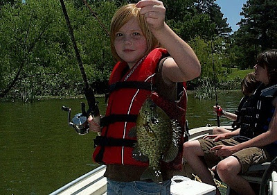 Saturday we had big plans to "do something" in the yard and/or with the fence and/or deck. No specific plans, we just knew we needed to get some work done. So around 8:30, Mark suggested that we go boating as a family. Sarah has really been wanting to fish with the boys but they stay too long for her. We headed out with a picnic basket and two coolers(one for the worms) around 10am. Mark backed the boat into the water while the girls played at the playground(at a city park on the shoreline of Lone Star Lake). Once in the water we trolled over to a good fishing spot. Mark couldn't get the regular motor to turn over. Not. At. All. And the trolling motor wasn't working at this point. So we rowed. And rowed. Luckily the fish were biting in the shallows and not far from the boat launch. We fished til around 3:30 or so, then rowed back across the lake. Sarah managed to catch the first, and biggest, catfish of the day!! It snapped her line and flounced out of the boat before we got a picture though. Ryan and Amy both caught catfish and Mark and Sarah ended up with brim too. Not a great day fishing but pretty exciting for the girls!